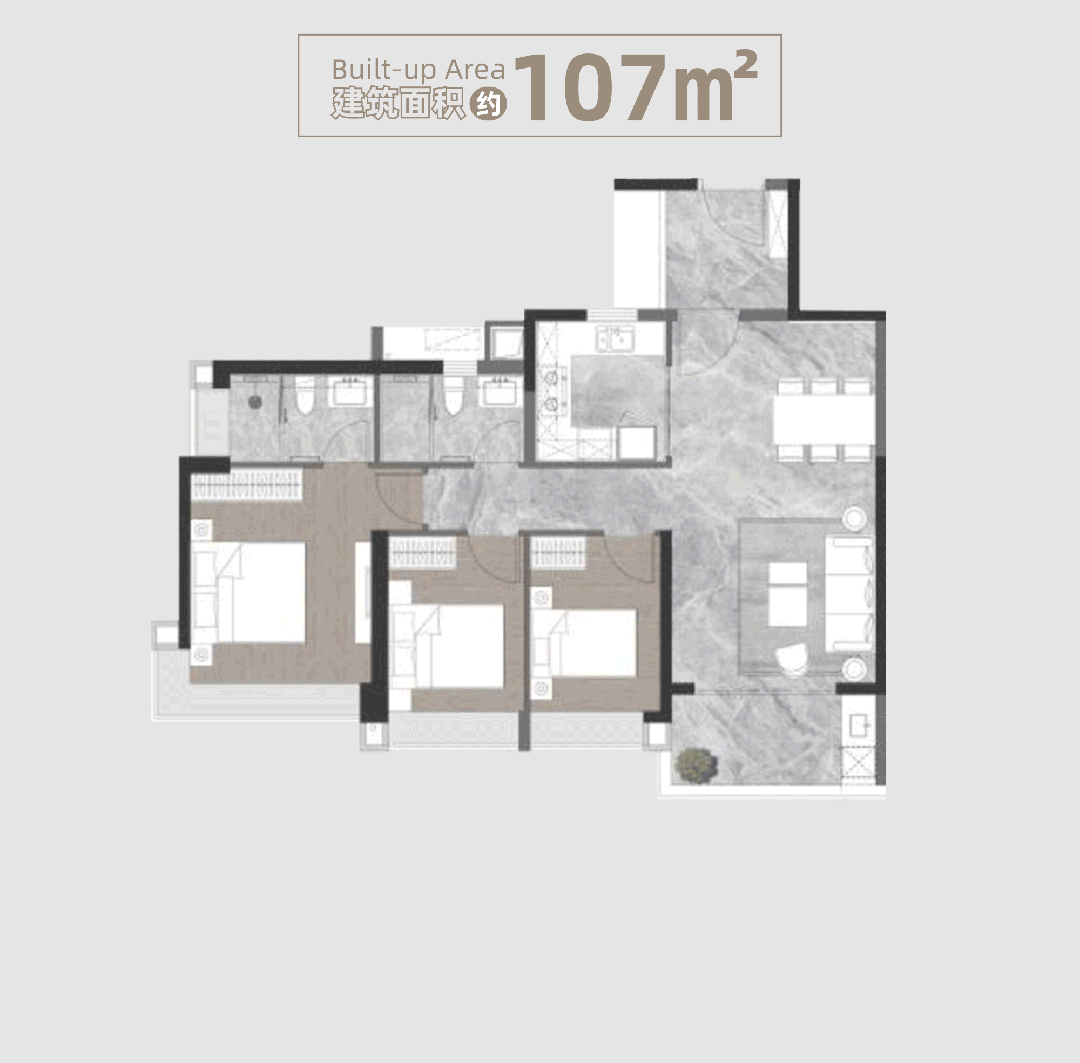 107平方米的三房户型则以适用性著称。入户花圃设想适用,添加了储物空间,便利放置鞋帽等物品。四开间朝东南,采光通风极佳,冬暖夏凉。客堂取阳台连通,扩大了视觉空间,让小户型也能具有大款式。厨房采用U型结构,操做台面充脚,动线流利,让烹调变得愈加轻松高兴。卫生间干湿分手,整洁卫生。这款户型很是适合年轻佳耦或小家庭,既满脚了根基的栖身功能,又兼顾了糊口质量。